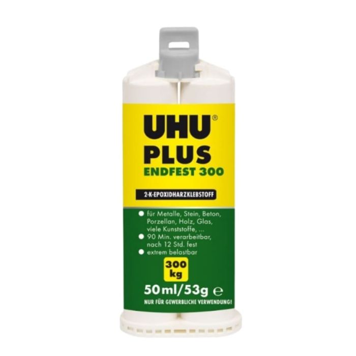 UHU PLUS ENDFEST ist ein universeller, zweikomponentiger Epoxidharzkleber mit hoher Endfestigkeit bis 19 N/mm² und einem Mischungsverhältnis von 1:1. Die Verarbeitungszeit beträgt etwa 90 Minuten, die Handfestigkeit wird nach ca. 6 Stunden erreicht. Die vollständige Aushärtung erfolgt nach 24 Stunden. Der Klebstoff ist lösemittelfrei, lackierbar und hat eine gute UV-Beständigkeit. Er eignet sich für Anwendungen mit Temperaturbelastungen von -40°C bis +100 °C. Die Konsistenz ist mittelviskos, was ein gutes Füllvermögen ermöglicht. Das Produkt ist wasserfest sowie beständig gegen Öle, Fette, Lösungsmittel, verdünnte Säuren und Laugen und eignet sich für präzise Reparaturen sowie strukturelle Anwendungen.