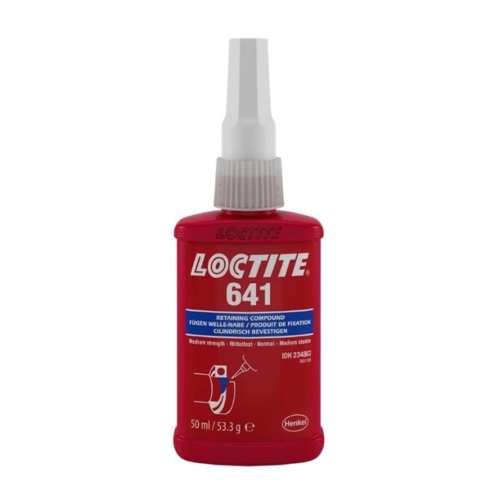 Loctite 641 ist ein anaerob härtender Klebstoff auf Methacrylatester-Basis, der speziell für das Fügen von zylindrischen Metallverbindungen entwickelt wurde. Die Aushärtung erfolgt unter Luftabschluss zwischen eng anliegenden Metallflächen, wobei mittlere Festigkeiten erreicht werden. Dadurch eignet sich das Produkt besonders für Anwendungen, bei denen eine spätere Demontage erforderlich ist, wie etwa das Befestigen von Lagern auf Wellen oder in Gehäusen. Der Klebstoff zeigt eine gute Temperatur- und Medienbeständigkeit und kann bei Bedarf durch Erwärmen auf ca. 250°C wieder gelöst werden.