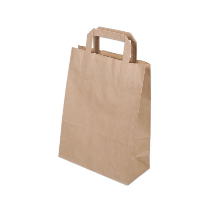 Diese mittelgrosse Papiertragtasche im Format 220 x 100 x 290 mm ist aus kräftigem, braunem Kraftpapier gefertigt und verfügt über stabile Flachhenkel, die innen befestigt sind und auch bei mittlerer Belastung einen sicheren Halt bieten. Die Tasche ist FSC®-zertifiziert, vollständig recyclingfähig und eignet sich sowohl für den Einzelhandel als auch für Take-away- und Cateringangebote. Sie bietet ausreichend Platz für Mahlzeiten, Backwaren oder kleinere Non-Food-Artikel. Die natürliche braune Farbgebung vermittelt einen umweltbewussten Eindruck und lässt sich bei Bedarf individuell bedrucken. Dank ihrer einfachen Handhabung, der stabilen Verarbeitung und des nachhaltigen Materials erfüllt die Tasche sowohl funktionale als auch ökologische Anforderungen.
